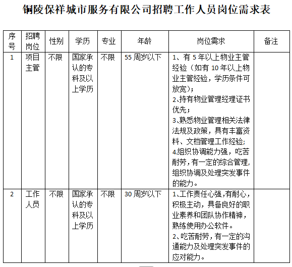 因業(yè)務(wù)發(fā)展需要,銅陵保祥城市服務(wù)有限公司面向社會公開招聘工作人員2名。具體事項(xiàng)公告如下:
